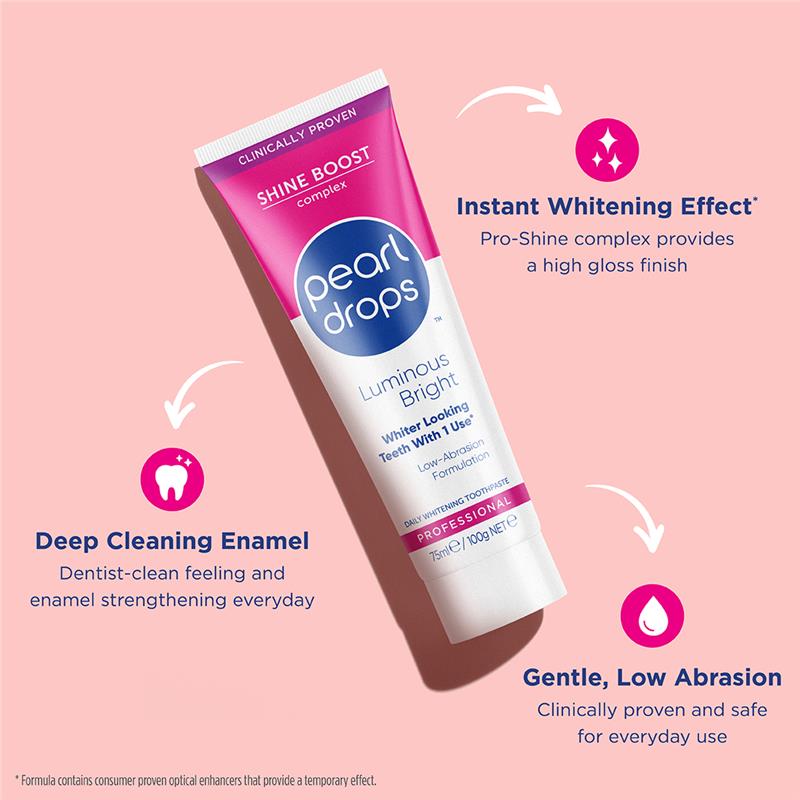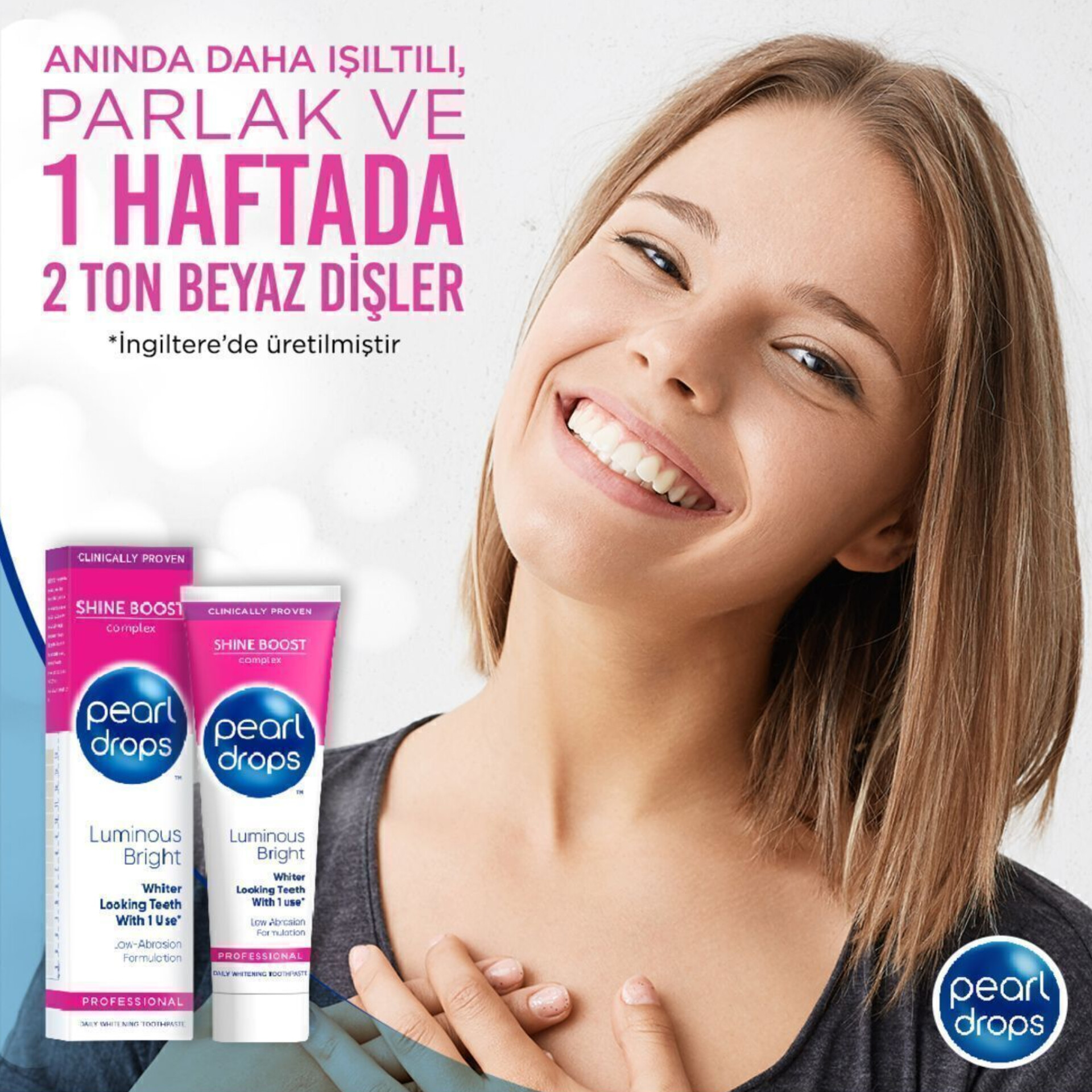 خمیر دندان Pearl Drops Luminous Bright با فرمولاسیونی پیشرفته و تخصصی طراحی شده تا تجربهای بینظیر از سفیدکنندگی و درخشندگی دندانها را در اختیار شما قرار دهد. این محصول حرفهای، که زیر مجموعهای از سری Shine Boost Complex است، با تکنولوژی نوآورانه خود قادر است تنها با یکبار استفاده ظاهر دندانها را سفیدتر جلوه دهد و درخششی طبیعی به لبخند شما ببخشد.